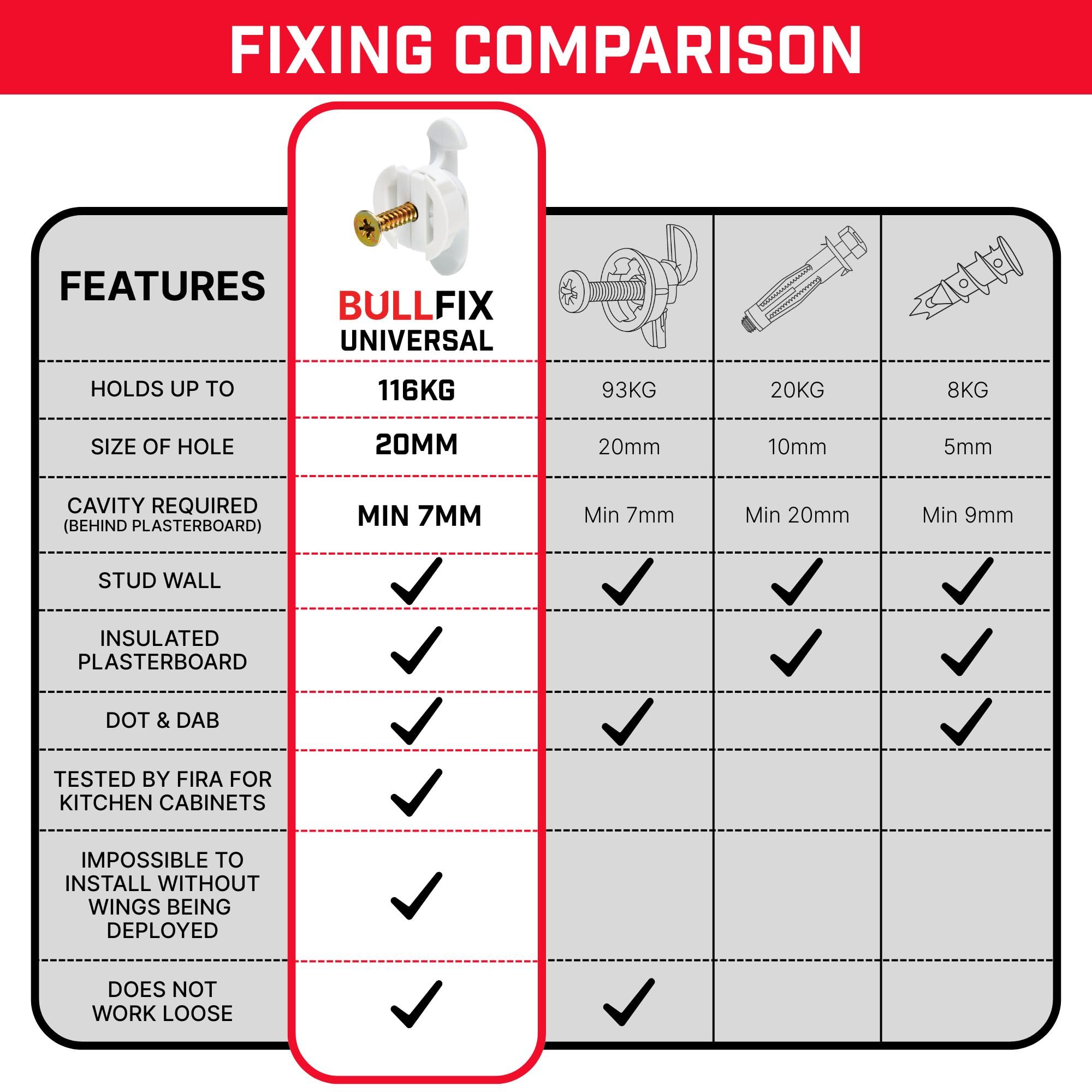 Bullfix Universal fixings are our most versatile fixings. Our innovative design spreads the load over a wider area, meaning that no matter what you are trying to fix to plasterboard, our fixings won’t fail you!